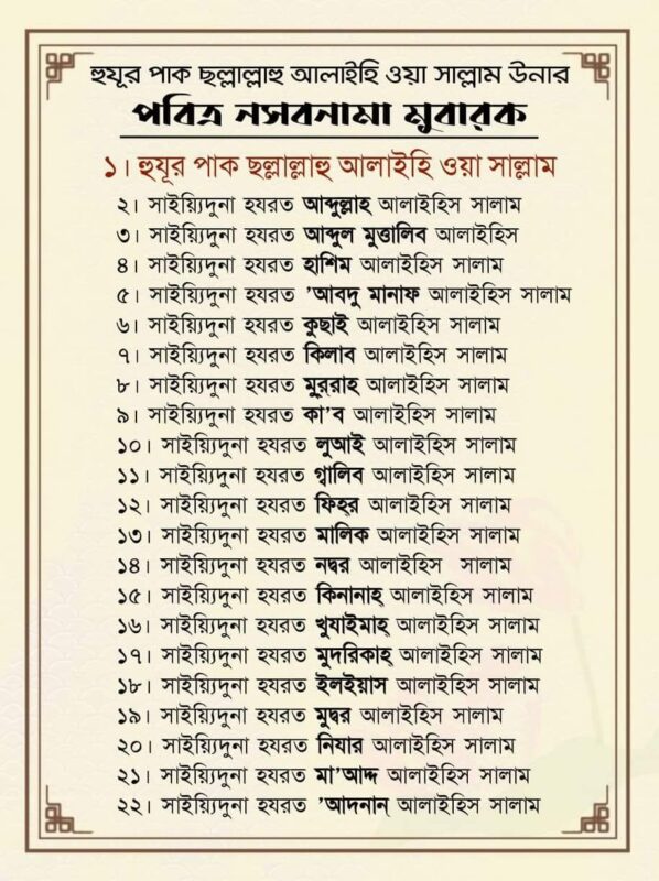 হুযূর পাক ছল্লাল্লাহু আলাইহি ওয়া সাল্লাম উনার সম্মানিত আব্বাজান আলাইহিস সালাম উনার দিক থেকে সম্মানিত নসবনামা মুবারক